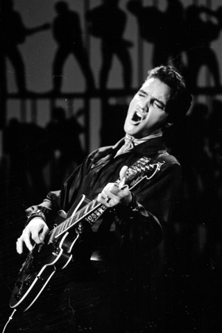 One can surmise that he pours out years of career frustration and pent-up creative energy into the performance of these songs. His natural talent, charisma, sensuality and stage presence have not been diminished by the years in Hollywood. In fact, Elvis looks, sounds, moves and grooves better than he ever has. At 33, he is better than he has ever been and better than anybody in the business. For the group jam session segments and solo stage performances, Elvis wears a two-piece, black leather outfit specially designed for the show by Bill Belew, who also designed the other wardrobe Elvis and the cast wear in the show. The look evokes the era of James Dean and the Marlon Brando type motorcycle films of the fifties, the era when Elvis was first proclaimed the King of Rock 'n' Roll.