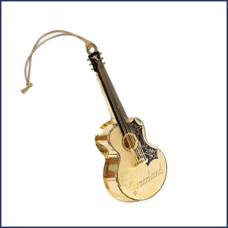 3D Guitar OrnamentGive the gift of holiday sparkle with this classic gold-tone acoustic guitar ornament. Crafted in layered die-cast metal with vintage-inspired details, it even features the custom pick guard Elvis designed himself. Embossed with the Graceland logo and Elvis’ name, this elegant ornament makes a meaningful keepsake for any Elvis fan and a festive heirloom to be treasured for years to come.