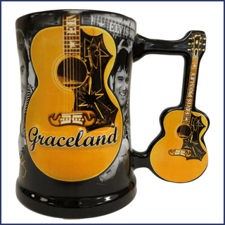 Elvis Graceland Guitar Handle Coffee MugMake their morning coffee extra special with the Elvis Graceland Guitar-Handle Mug. Featuring a guitar-shaped handle, a bold full-color Graceland logo, and wraparound black-and-white Elvis images, this ceramic mug is both fun and functional.