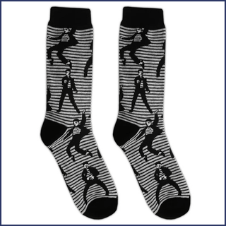 Elvis Jailhouse Rock Crew SocksTreat the Elvis fan on your list to a fun twist on a classic look with the Elvis Jailhouse Rock Crew Socks. This pair of jailhouse-style fashion socks feature an all over black & white striped Elvis Jailhouse Rock graphic on each side with matching black cuffs, heels, and toes.