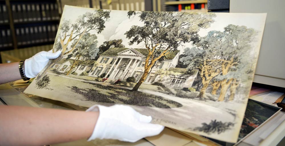 The Archival staff works congruently with other departments within Elvis Presley Enterprises, as well as outside associations of designers, graphic artists, and architects to maintain, design and install all exhibition spaces on the Graceland campus. Graceland's archives of Elvis history also maintains the artifact collection of photographs, textiles, objects, film, video, tape, and documents that are currently in storage. An important function of this department is the tracking of the collection, as well as the creation of a complete digital catalog of the Elvis Presley Archives at Graceland. It is also the job of the Archives staff to preserve and conserve the artifacts located in the Mansion and all other exhibits here at the Graceland Mansion.